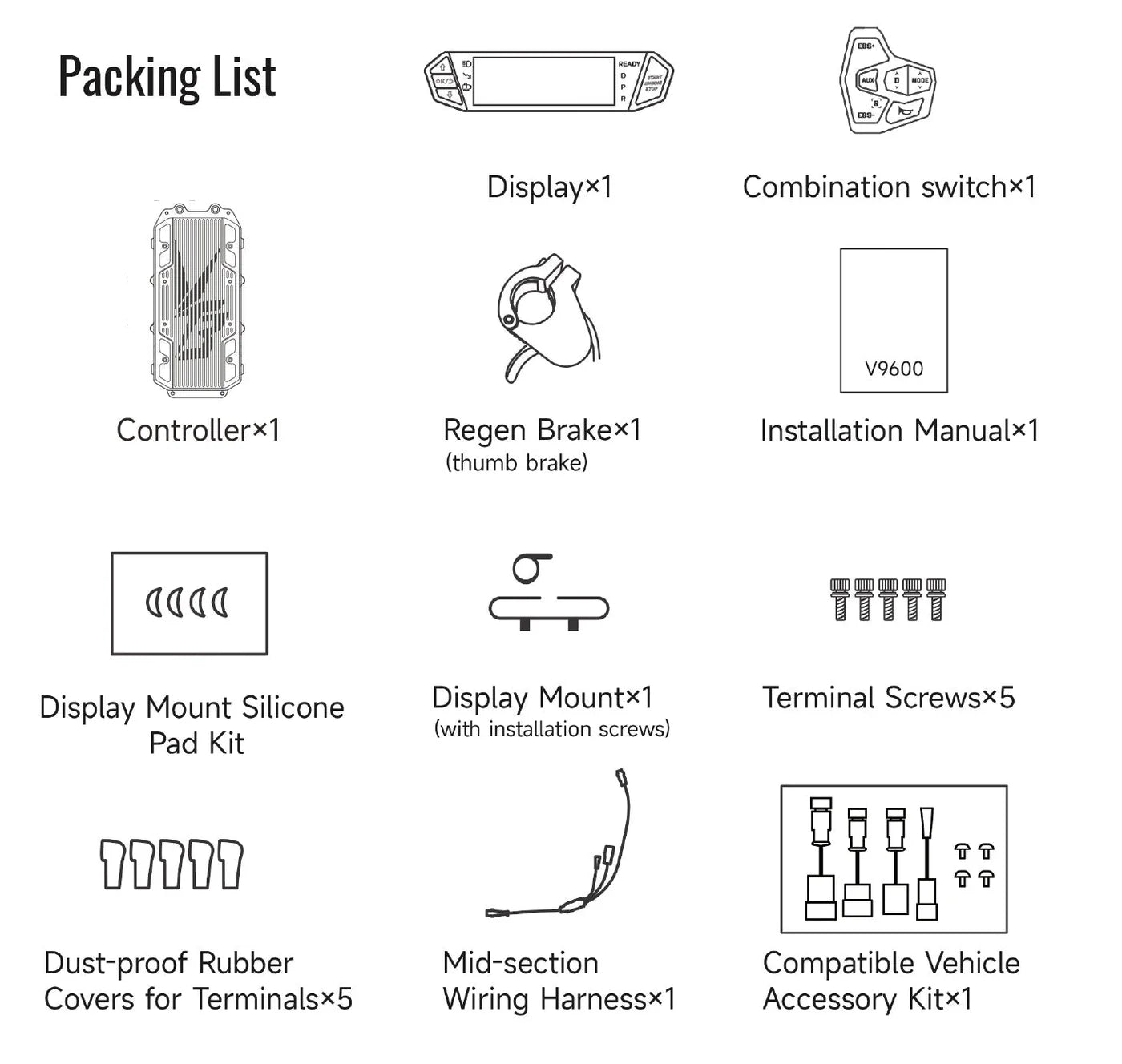 Included in the Box - Controller - Full Color Display - Left Hand Mode Switch - Regen Lever - Owner’s Manual - Display Mounting Hardware - Terminal Screws - Rubber Terminal Covers - Mid-Harness
